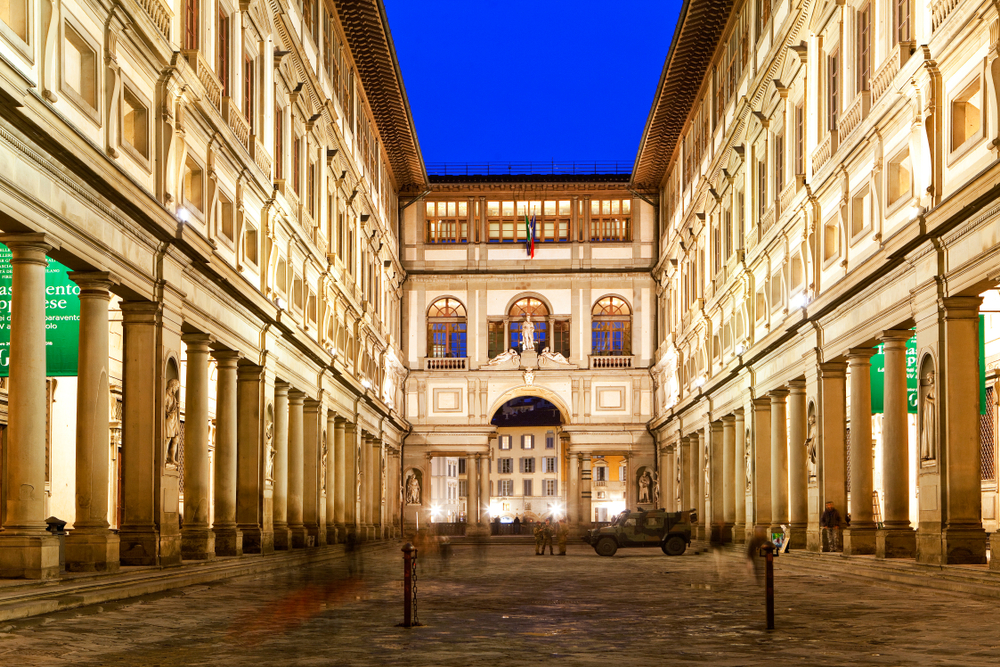 En su interior podemos encontrar grandes obras de Botticelli, Miguel Ángel, Leonardo da Vinci y Rafael entre otros. Recibe más de un millón de visitantes anuales para poder admirar obras como “El nacimiento de Venus” de Botticelli, “La Anunciación” de Leonardo da Vinci o la “Sagrada Familia” de Miguel Ángel.