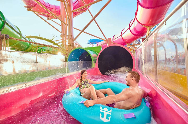 Los más pequeños tienen su propio espacio en Splashaway Bay℠, una zona acuática infantil con fuentes interactivas, mini toboganes y juegos de agua. Mientras tanto, los adultos pueden relajarse en alguna de las siete piscinas y diez jacuzzis distribuidos por el barco. Destacan Royal Bay℠, la piscina más grande en alta mar; Water’s Edge, ideal para familias; y The Hideaway, una piscina infinita suspendida solo para adultos. Para quienes buscan un cóctel refrescante, Swim & Tonic℠ es el bar-piscina flotante perfecto.