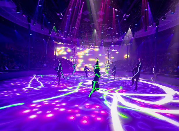 El entretenimiento también está a otro nivel. El AquaTheater sorprende con espectáculos acuáticos frente a una cascada de 17 metros, mientras que Absolute Zero ofrece shows sobre hielo. El Royal Theater presenta producciones estilo Broadway, y otras opciones como karaoke, escape room, boleros y arcade aseguran diversión para todos los gustos.