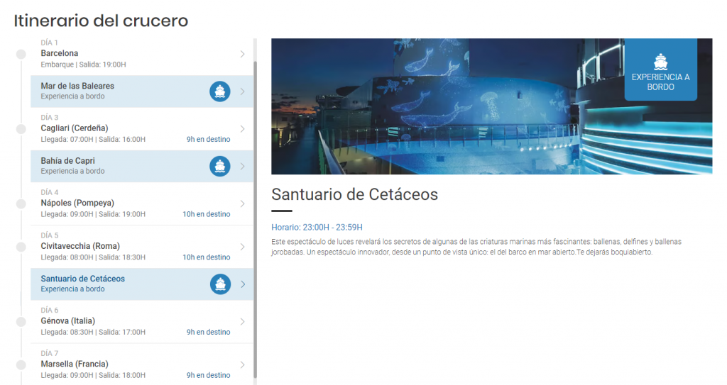 En nuestra web Logitravel.es son fácilmente identificables dentro de los itinerarios de los Cruceros, donde estarán indicados como “Experiencias a bordo”. Si deseas saber más sobre las experiencias incluidas en el itinerario de un crucero sólo tienes que seleccionar el crucero de Costa que te interese e ir a la sección de detalle del itinerario, una vez seleccionado el Sea Destination aparecerá junto a él una breve descripción de la actividad prevista.